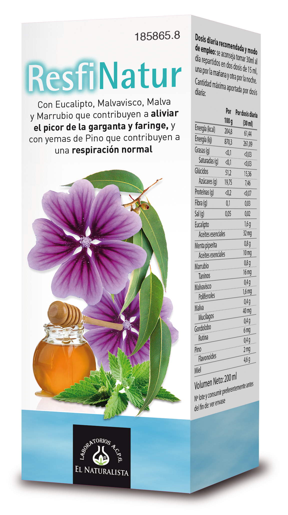 La tos es uno de los síntomas más molestos. Resfinatur El Naturalista es un jarabe natural para la tos, que combina las propiedades de Eucalipto, Malvavisco y Marrubio entre las que destacan aliviar el picor de garganta y faringe, con las del Pino de con- tribuye a calmar las vías respiratorias.